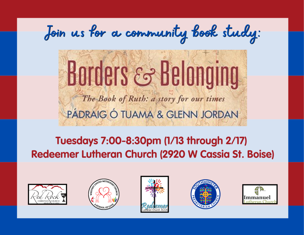This winter, Southminster is joining with our ecumenical friends in Boise for a shared book study on Borders & Belonging: The Book of Ruth—A Story for Our Times by Pádraig Ó Tuama and Glenn Jordan. Together, we’ll explore the ancient story of Ruth as a lens for reflection on forced migration, faithfulness, and what it means to belong in a world shaped by borders.