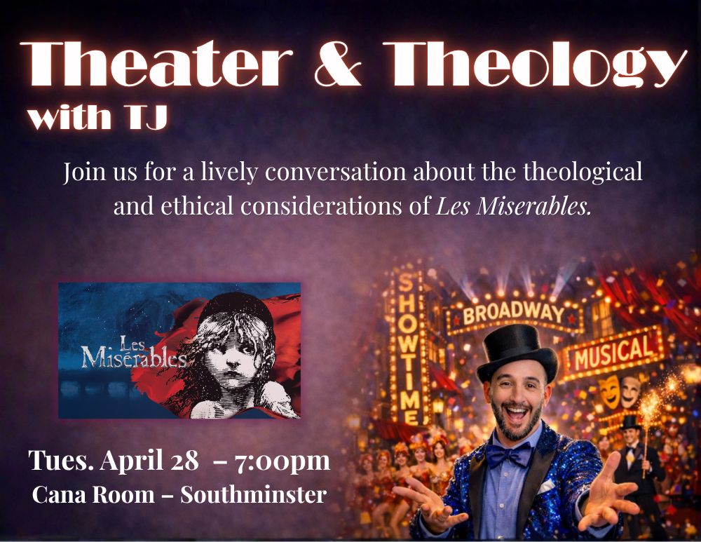 Join Pastor TJ for a special “Theater & Theology” conversation on Tuesday April 28 from 7:00-8:30pm in the Cana Room for a lively conversation about the theological and ethical considerations of Les Mis.
